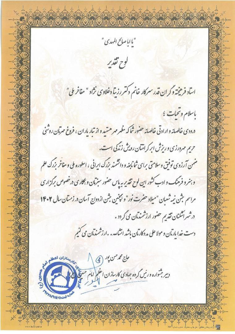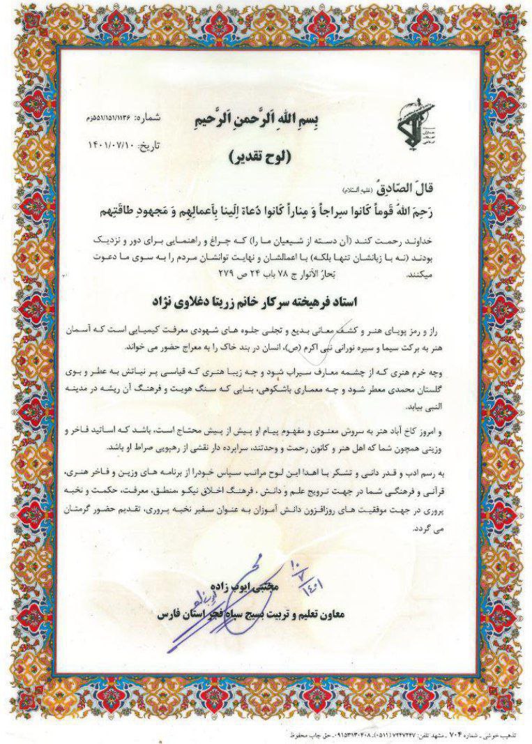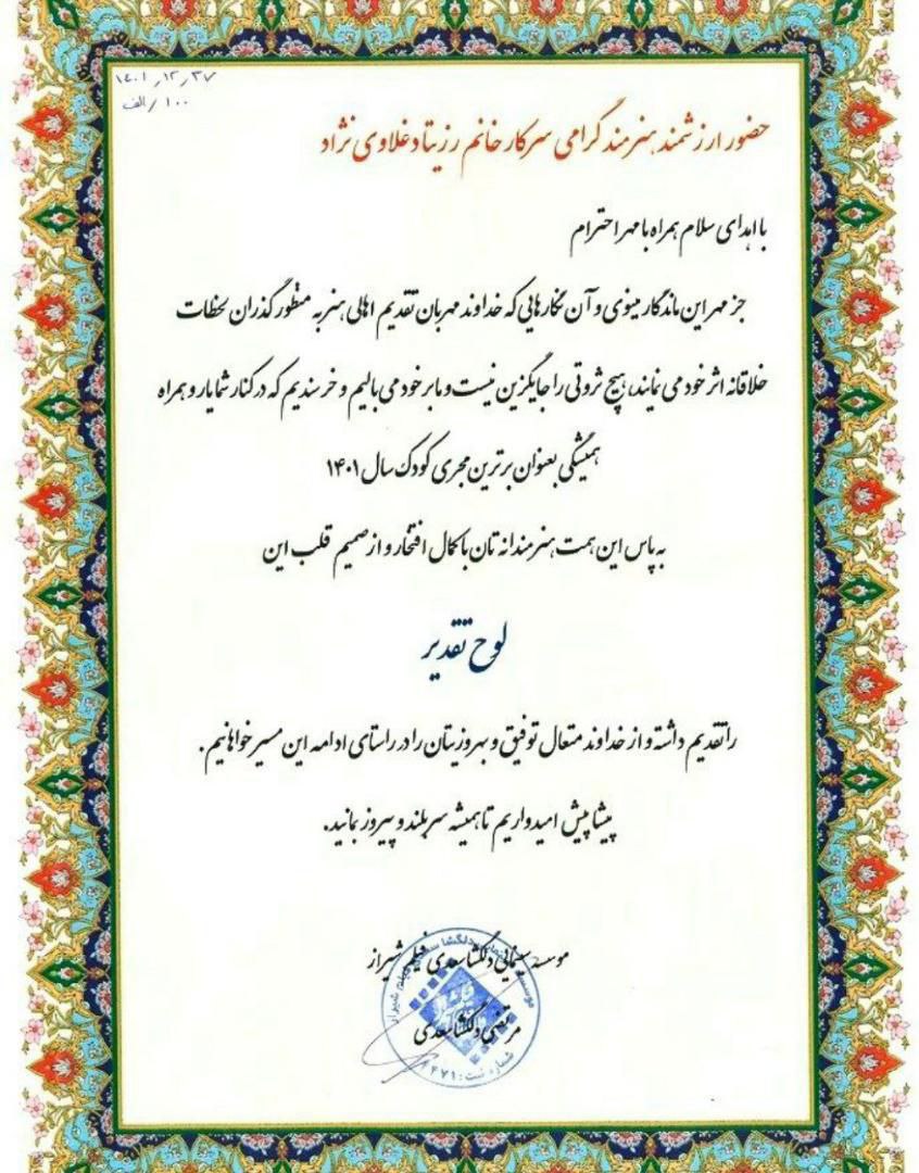 بخشی از تقدیرنامه های رزیتا دغلاوی نژاد